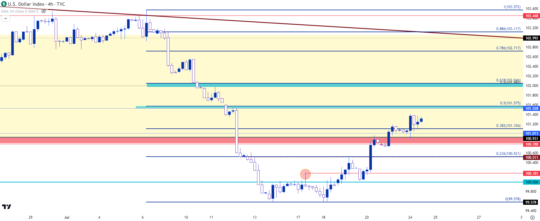 但是正如我在那之后不久所说的最大的问题是空头还有多少决心,我已经强调过先前作为支撑的区域,关注走低的高点阻力位会如何起作用。该区域位于2023年上半年的支撑位附近,在DXY图表上的100.80-101区域附近。